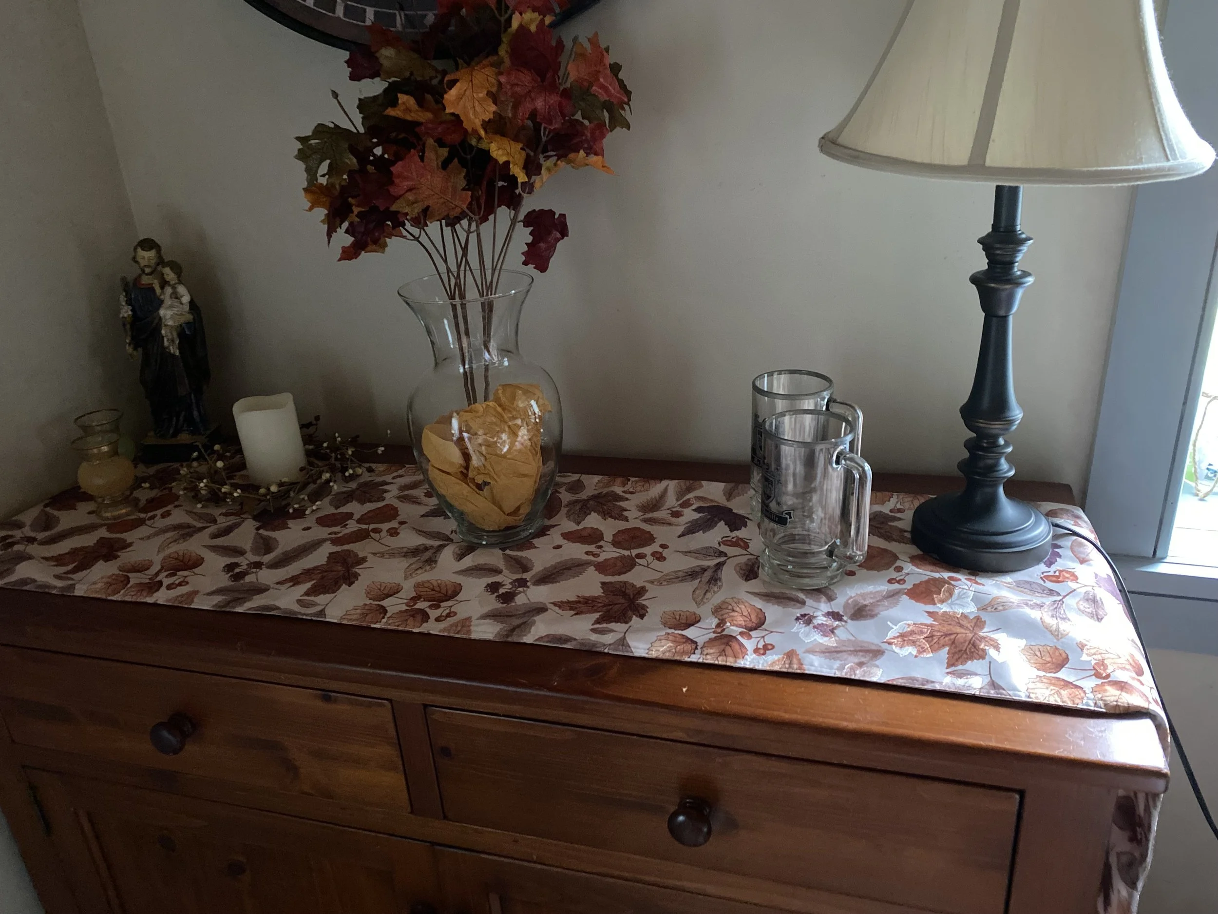 While visiting this past weekend, I noticed my mom had used a runner on her fireplace mantel. I liked the idea so much that I tried it in my living room. I think it looks great. [The candle is on a timer and lights up at night.]