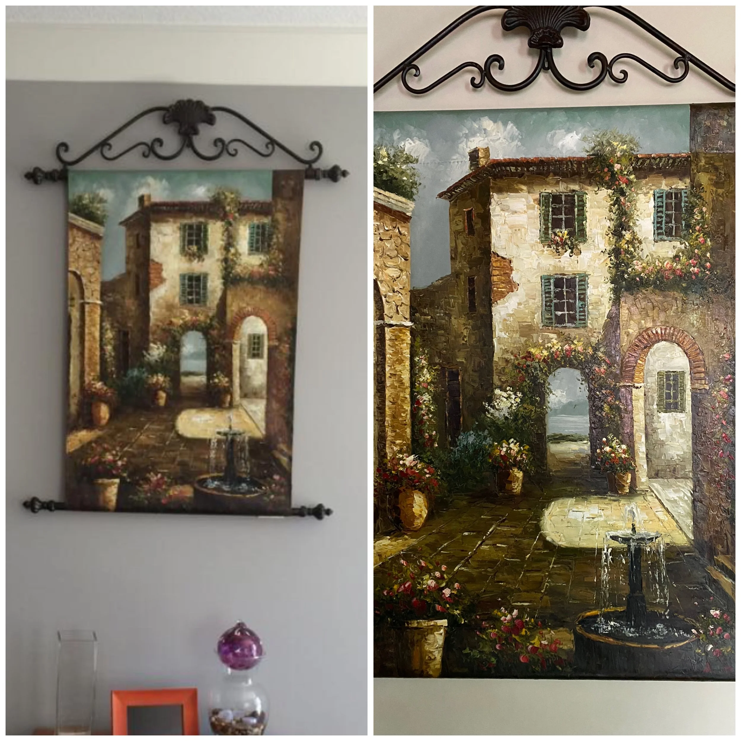 Unfortunately, the picture on the left isn’t great quality and I don’t have a picture of the burgundy wall on which my painting also hung. What I love about this painting is how it looks a little different depending on the location, the lighting, and the wall colour. I’m very attached to it, especially since it always fits in whatever house I own.